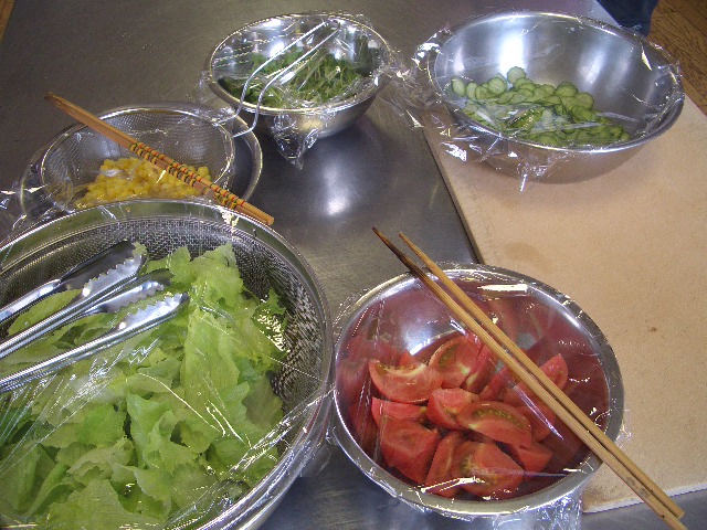 レタス、きゅうり、トマト、コーン、ツナ、貝割菜、と材料準備です。