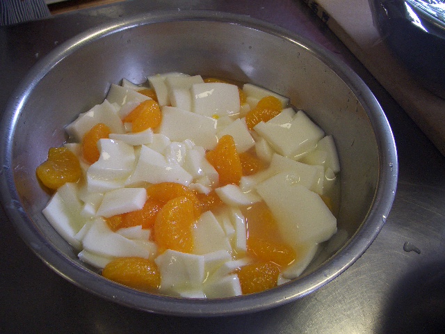 牛乳寒天のいい匂い、デザートづくりも同時進行。上手に塊まり ホット一息。