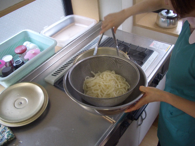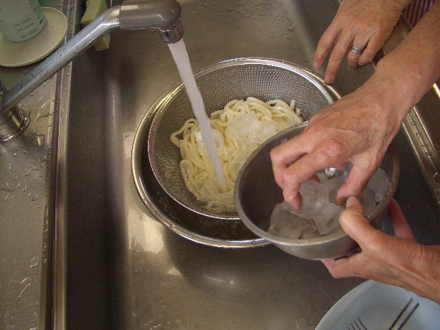 ゆで上げたうどんはたっぷりな水で洗い、氷でしめました。