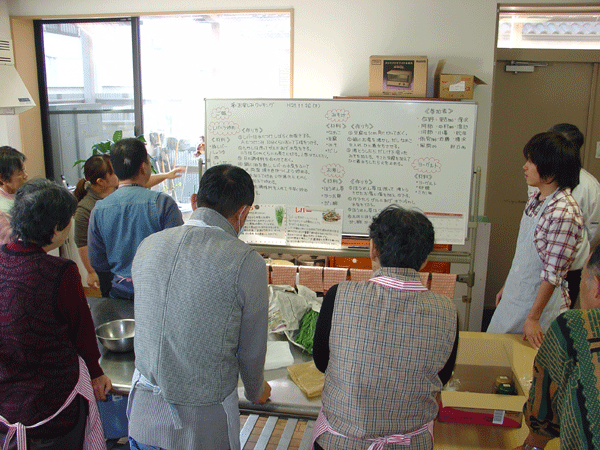 ます。栄養課へ食材を取りに行く人、ご飯を炊く準備をはじめる人。
