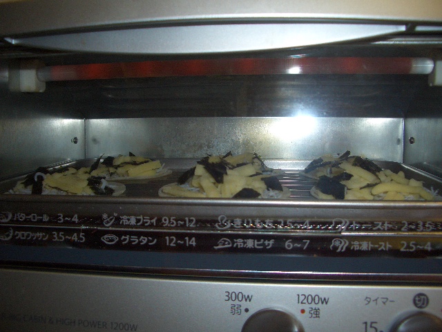 ギョーザの皮にしらす→とろけるチーズ→のりの順に乗せてトースターで焼くだけ