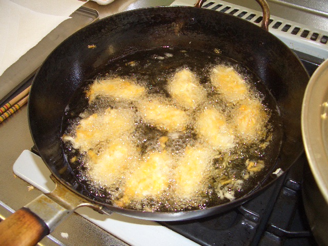 休憩も終わりさっそく(W)さんがカキフライを揚げてくれました。油を使って