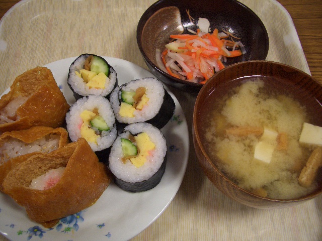 作るのは、太巻きといなり寿司です^^付け合せで味噌汁となま