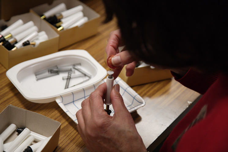 新しい作業は、プラスチックの円筒形の5㎝ほどのケースにバネを
